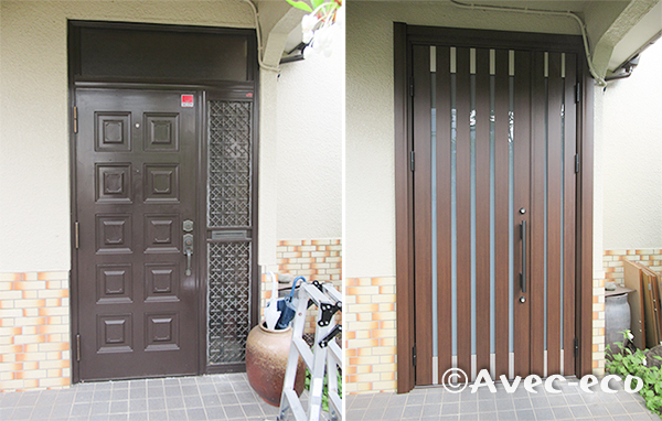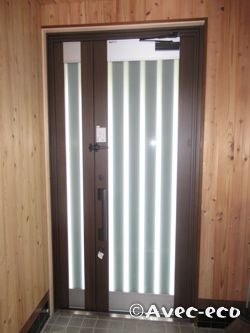 • ランマ付き、袖付きの玄関ドアをランマなし親子ドアに交換しました。